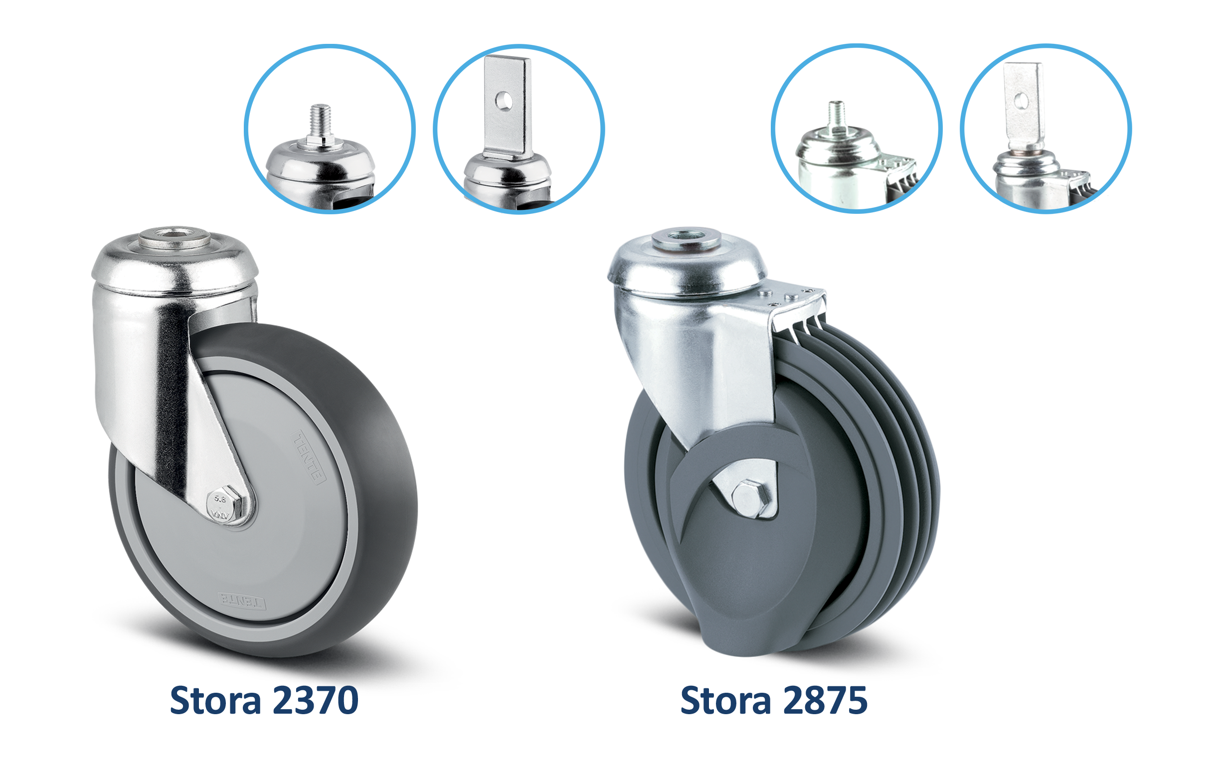 TENTE propose plusieurs modèles de roulettes pour équiper vos chariots libre-service et de magasin, en fonction de l’agencement de votre point de vente :