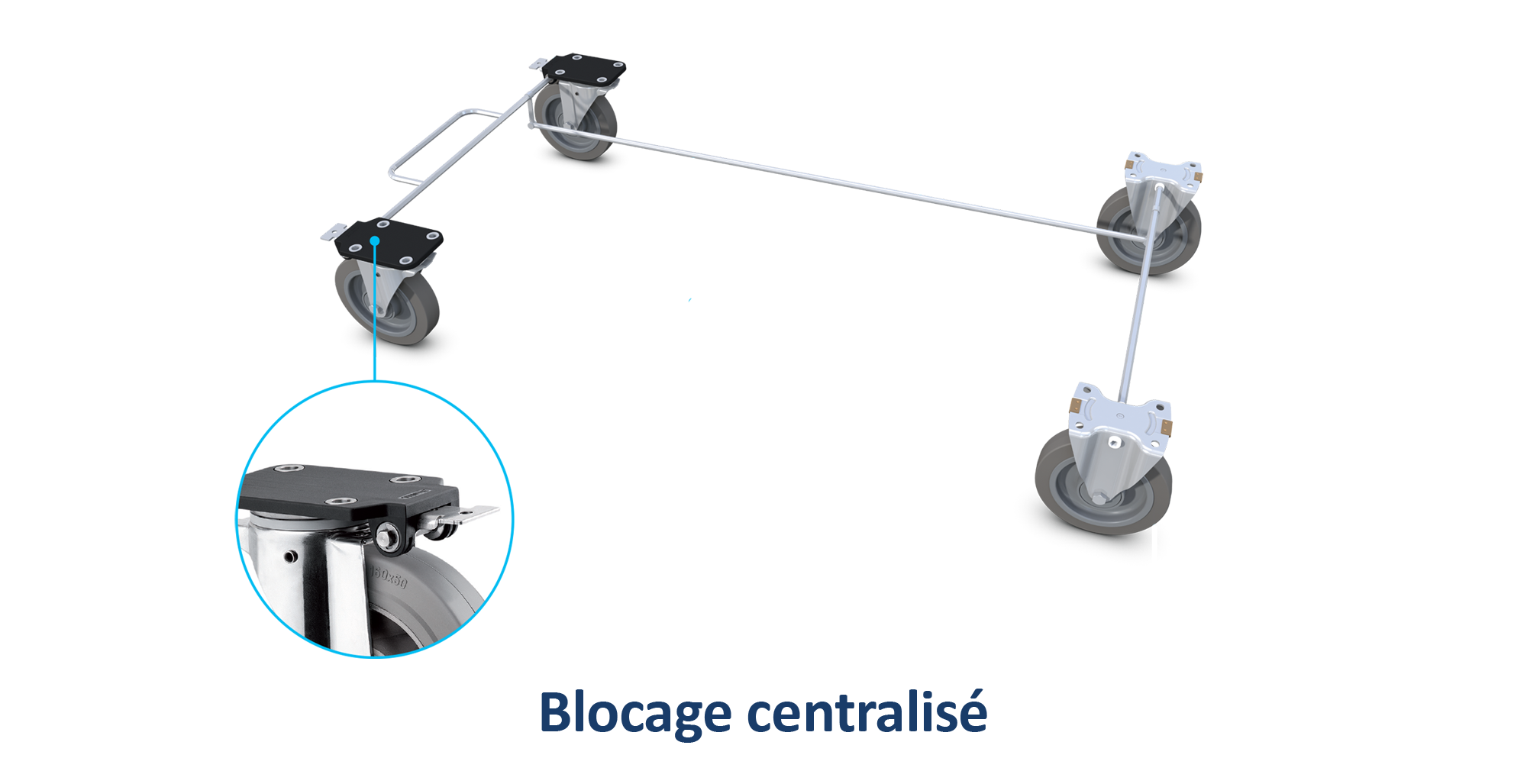 Le système de blocage centralisé permet de bloquer plusieurs roulettes en même temps à l'aide d'une seule pédale à frein. Relié à au moins deux roulettes, il permet de passer rapidement et facilement d'un état libre (non freiné), à un blocage directionnel (blocage du pivot) et/ou à un blocage total (blocage du pivot ET de la roue). Le blocage centralisé peut être actionné de façon mécanique, avec le pied, ou électrique, avec la main.