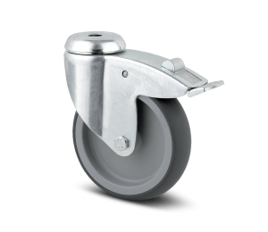 Cette roulette pivotante à blocage total est conforme à la norme EN 12530. Elle est dotée d’une chape en acier embouti et d’un pivot sur double chemin de billes. Sur la chape, une pédale de frein est présente. Cette dernière permet le blocage simultané de la roue et du pivot par le simple actionnement de la pédale de frein.